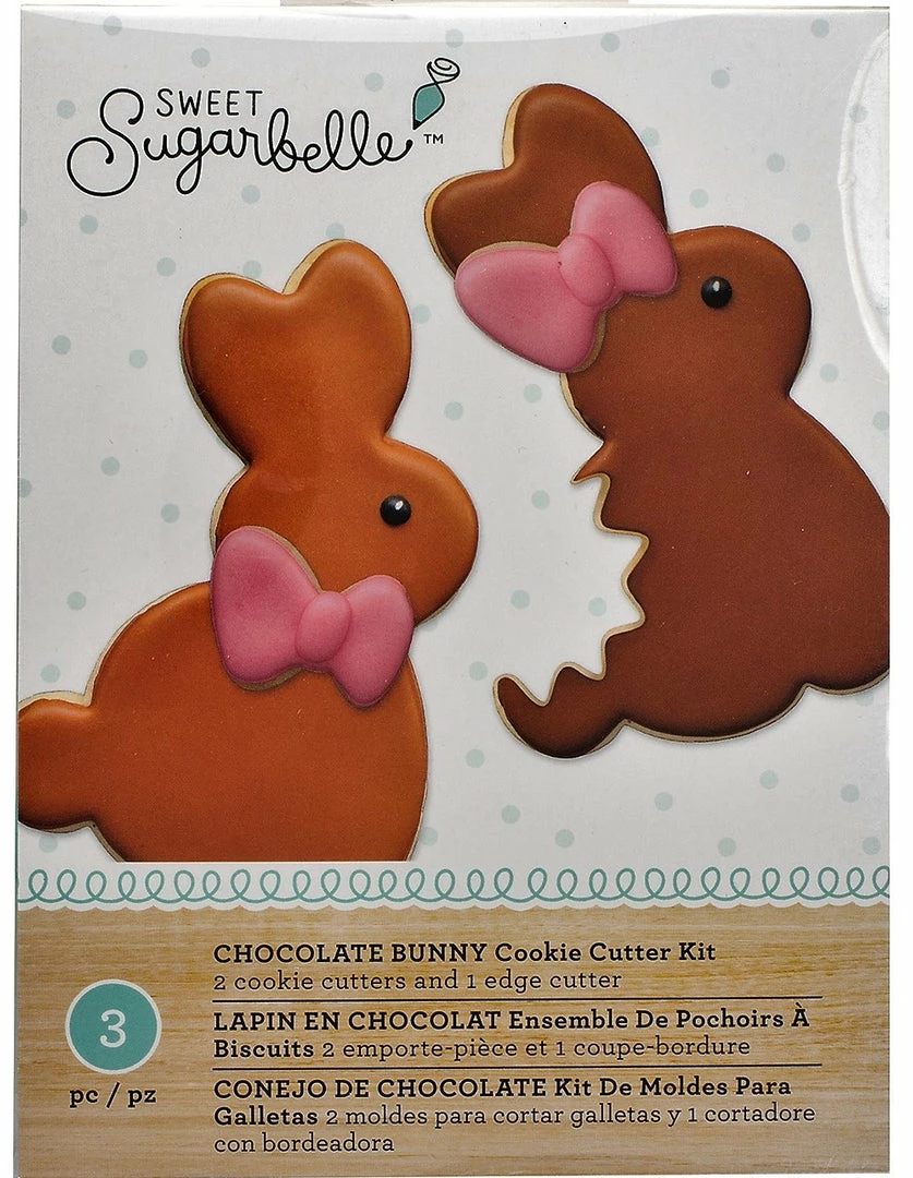 Sweet Sugarbelle Chocolate Bunny specialty kits comes with a bunny cookie cutter, mini bow cookie cutter and 1 edge cutter.