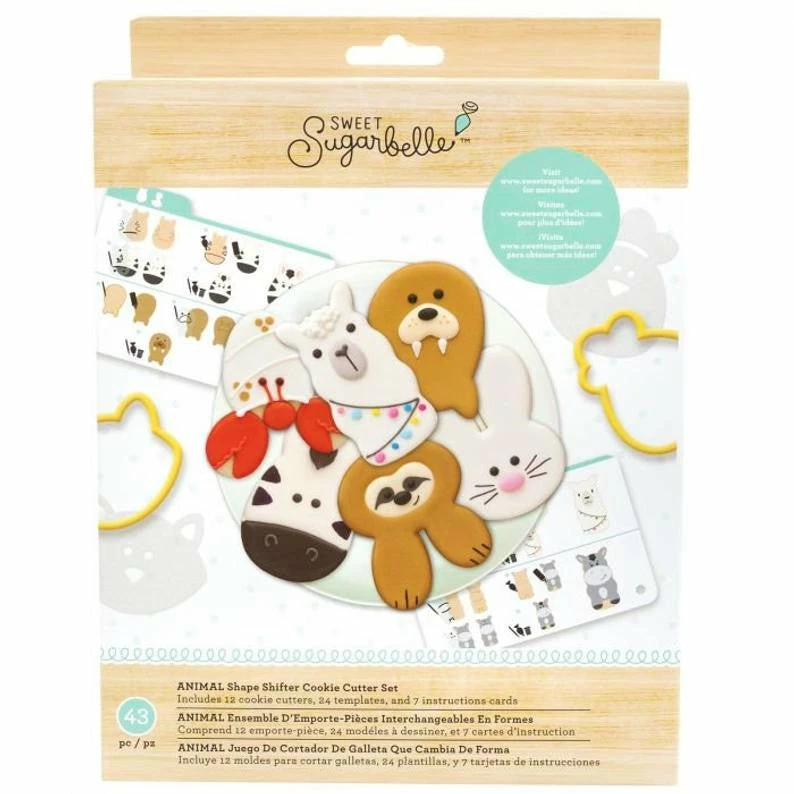 Sweet Sugarbelle Animal Shape Shifters Set. Simply cut, stamp, and bake. This set comes with 12 cutters, 24 templates, and 7 instruction cards. Transform your cookies into a herd of tasty treats! Click Enlarge to view all 12 cutter designs.