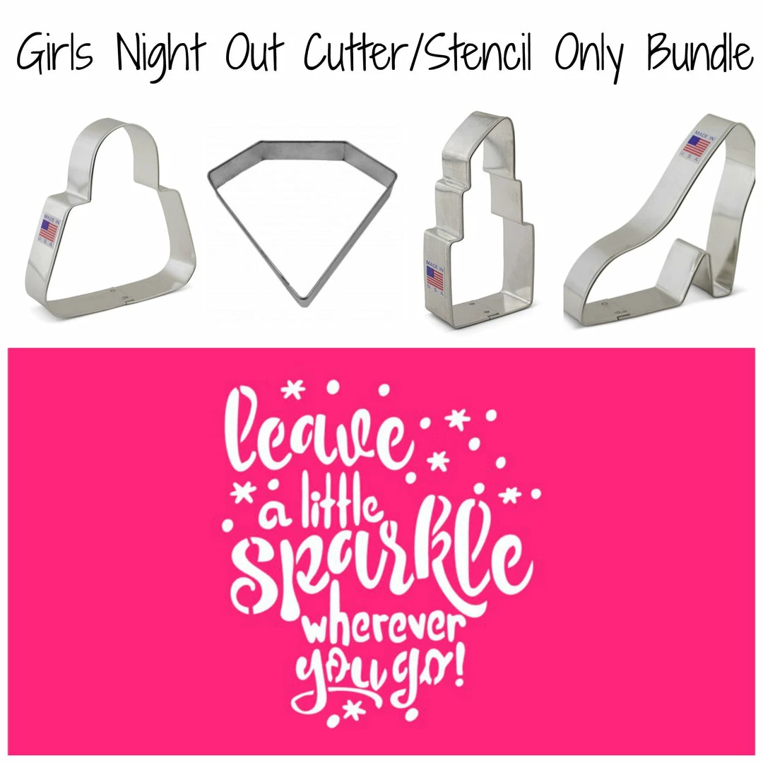 This Girls Night Out Cookie Cutter Bundle was created for an online class hosted The Flour Box! Purchase the recording of the class. CLICK HERE TO PURCHASE THE CLASS RECORDING. The cost for the class recording is $20. This Girls Night Out Cookie/Stencil bundle includes: Purse, Diamond, Lipstick, and Platform Shoe Cookie Cutter and the ‘Leave a Little Sparkle’ Stencil. . Cutter Size: Purse Size 4″, Diamond 4″, Lipstick 3 7/8″, and Platform Shoe Size 5″.