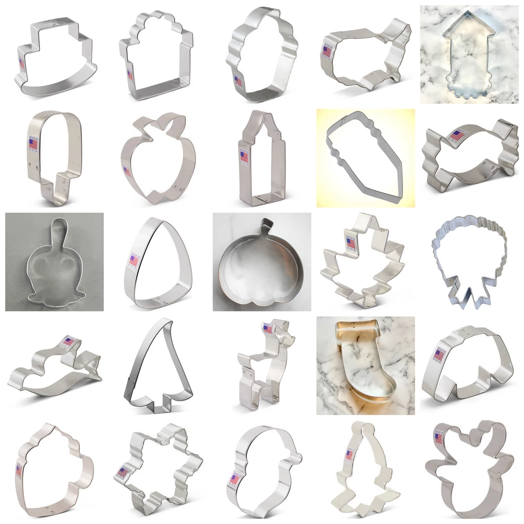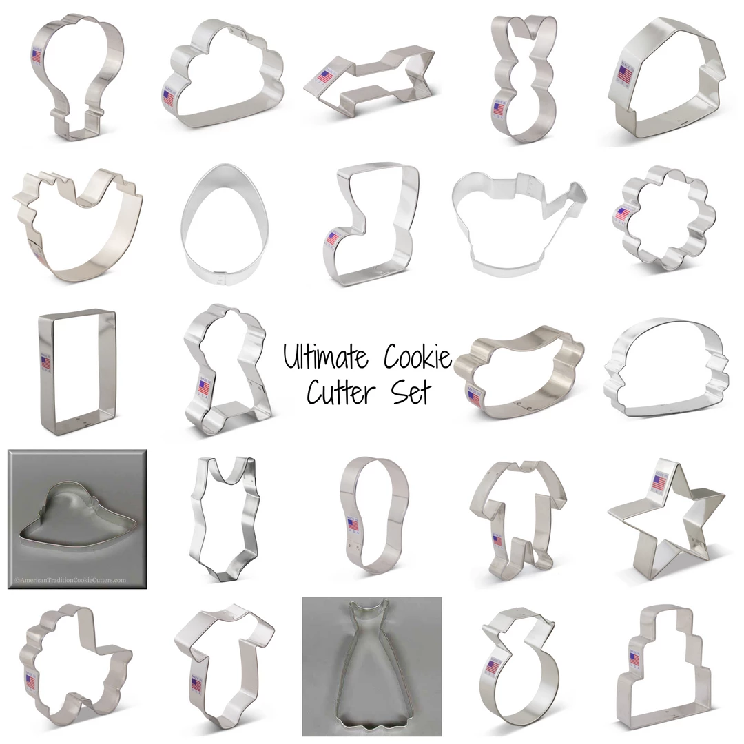 The Crafted Cookie Ultimate Cookie Cutter Set includes the 49 cookie cutters featured in the book: Baby Footie Pajama 4 1/2″, Baby Carriage 3 1/2″, Star New 3 3/8″, Onesie 4″, Cake with Candle 4″, Cupcake with Swirl 4″, Present with Bow 3 1/4″, Diamond Ring 3 3/4″”, Dress 4 3/4″, Wedding Cake 3 3/4″, Hot Air Balloon 4 1/4″, Arrow 4 1/2″, Cloud 3 3/4″, Barn 3 1/4″, Chicken 3 /14″ x 3″, Bunny Peep 4 1/8″, Egg 2 1/2″, Rectangle 3 7/8″, Rubber Boot “, Watering Can 4″, Flower Small 3″, Hamburger3.5″, Grill 3.75″ x 2.5″, Hot Dog by The Flour Box Bakery 4″ x 2″”, Crayon 3 5/8″, Flip Flop 4 1/8″, Swimsuit One Piece 4″, Bonnet 4 1/2″, USA Map 4″, Firecracker “, Popsicle 4″ X 2”, Cute Apple 3 1/2″, Chunky Pencil 4 1/2″, Crayon 3 5/8″, Round Pumpkin 3 1/2 “, Caramel Apple 4″, Candy Corn 4″, Candy Wrapped 3 5/8″, Wreath with Bow 4″, Round Pumpkin 3 1/2 “, Maple Leaf 3 3/4″, Mug Cookie Cutter by Flour Box Bakery 3 7/8″, Ugly Sweater Cookie Cutter 3 1/4″, Snowflake Large Cookie Cutter 4 1/2”, Santa Whimsical Face Cookie Cutter “, Reindeer Face Cookie Cutter by The Flour Box Bakery 3 3/4″, Elf Face New Cookie Cutter 3″ x 4″, Stocking Christmas Cookie Cutter 5″, Cute Deer Cookie Cutter 4 1/4″, Woodland Tree Cookie Cutter 4″, and Flying Dove Cookie Cutter 4 3/8”.