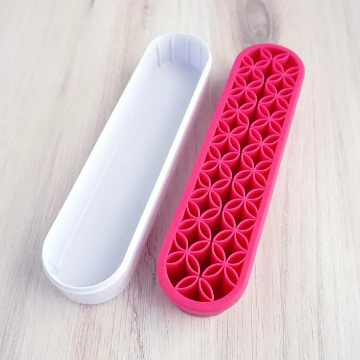 Place this sturdy holder on your work station to easily store brushes and tools within reach. It solves the problem of needing a place to put a wet brush while you’re still working with it. This holder can come apart for easy cleaning. Hand wash in warm, soapy water. Measures 8.25″ long, 2″‘ deep, and 1.25″ high.