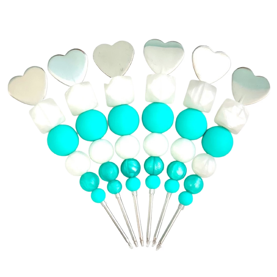 The Classic Chic Turquoise Swirl cookie scribe from The Flour Box is a fun tool essential to cookie decorating. Use your cookie scribe to tap icing into place, pop air bubbles, or create interesting designs in icing. Scribe is made from stainless steel and comes packaged with a bead stopper and tip safety stopper. The scribe measures 4.8” in length. Scribe beads are the highest quality, non-toxic and easy to clean with mild soap and water! They are 100% Food Grade Silicone – 100% Non-toxic, tasteless and odorless – BPA Free – Lead Free – PVC Free – Mercury Free – Phthalates Free – Cadmium Free