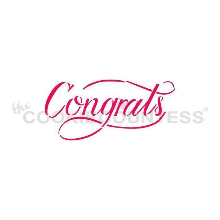 Congrats stencil. Design measures 3.25″ x 1.51″. Overall stencil size is approximately 5.5″ x 5.5″. PINK sections in image are the open sections. Stencils are 5mil Food Grade plastic, washable and reusable. Made by the Cookie Countess.
