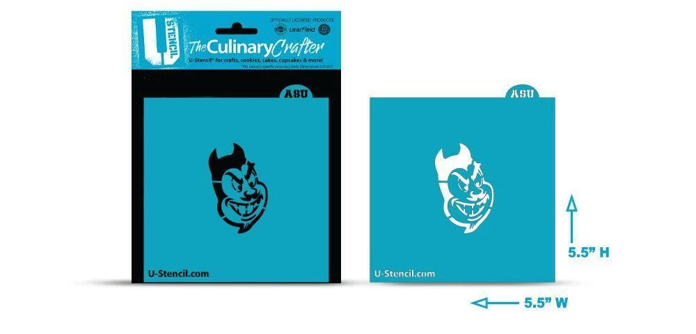 **Â FOR PERSONAL USE ONLY **Â Arizona State Sparky College Stencil. Overall stencil size is approximately 5.5″ x 5.5″. Black sections in image are the open sections. Stencils are clear food-safe plastic, washable and reusable. Made by U Stencil and are officially licensed products.