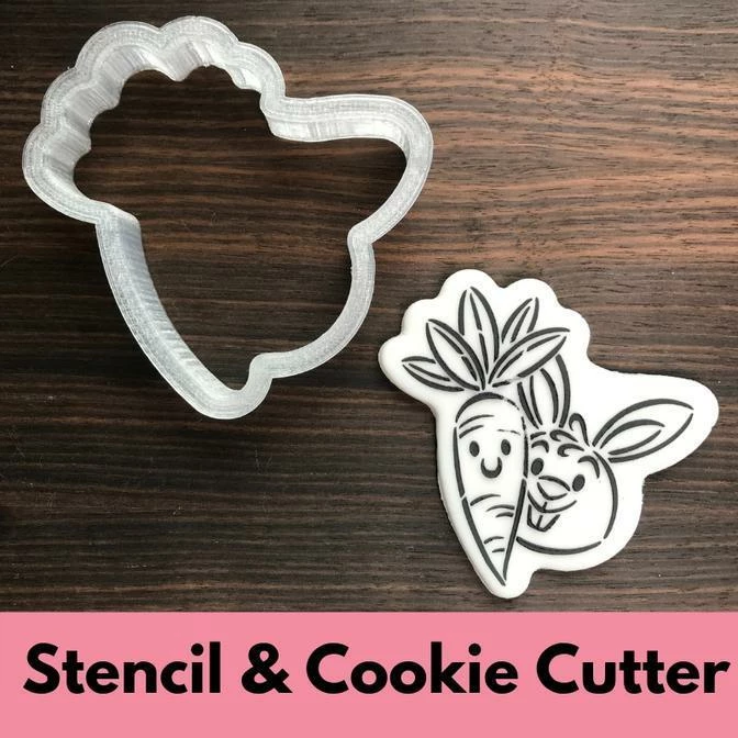 Carrot and Bunny Buddies Paint Your Own Stencil and Cutter Set. Use cookie cutter with matching stencil. Overall stencil size is approximately 5.5″ x 5.5″. PINK sections in image are the open sections. Stencils are 5mil Food Grade plastic, washable and reusable. A 3D printed cutter is made from food safe PLA plastic, and measures approximately 3.49″ x 3.42″. Hand wash with gentle detergent in warm water. Made by the Cookie Countess.