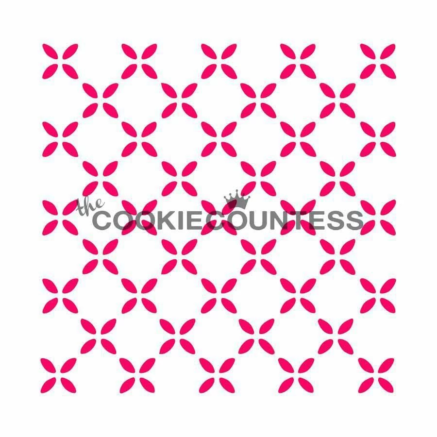 Country Flowers stencil. Overall stencil size is approximately 5.5″ x 5.5″. PINK sections in image are the open sections. Stencils are 5mil Food Grade plastic, washable and reusable. Made by the Cookie Countess.