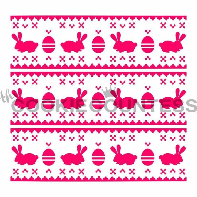Easter Fair Isle stencil. Overall stencil size is approximately 5.5″ x 5.5″. PINK sections in image are the open sections. Stencils are 5mil Food Grade plastic, washable and reusable. Made by the Cookie Countess.