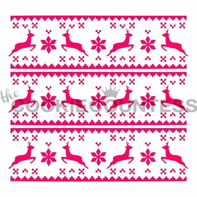 Fair Isle Sweater stencil. Overall stencil size is approximately 5.5″ x 5.5″. This stencil fits this Ugly Sweater Cookie Cutter. PINK sections in image are the open sections. Stencils are 5mil Food Grade plastic, washable and reusable. Made by the Cookie Countess.