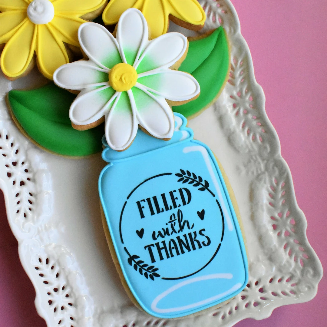 Filled with Thanks stencil. Overall stencil size is approximately 5.5″ x 5.5″. PINK sections in image are the open sections. Stencils are 5mil Food Grade plastic, washable and reusable. Made by the Cookie Countess.