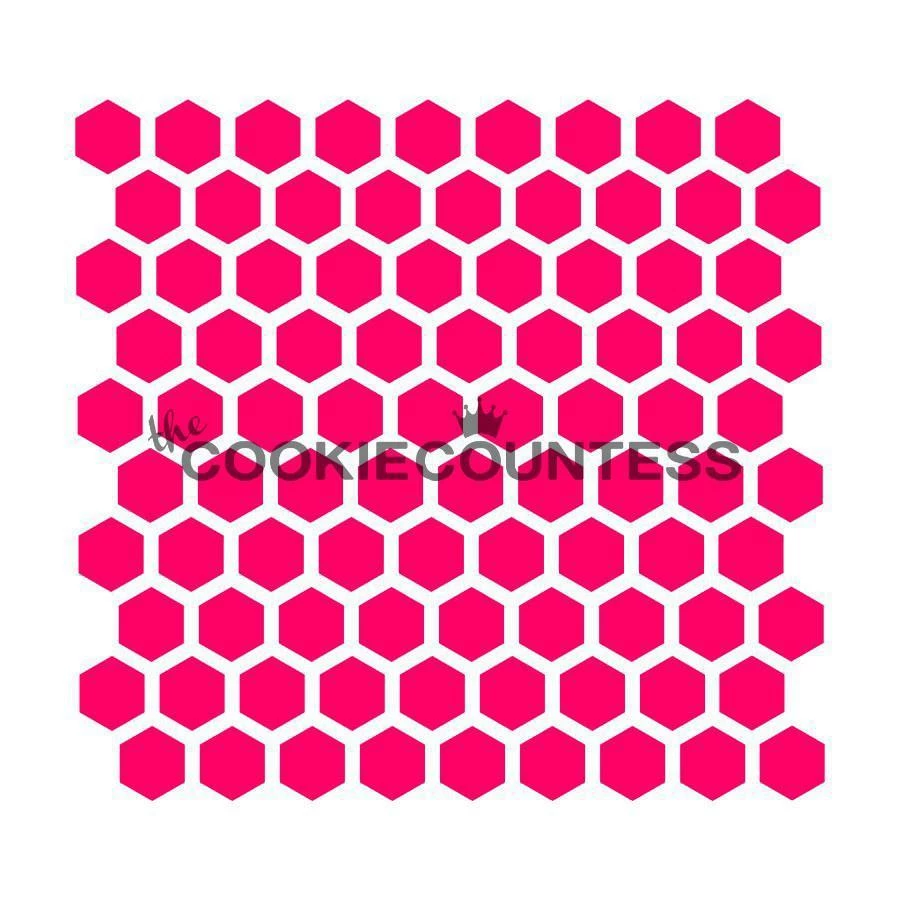 Honeycomb stencil. Overall stencil size is approximately 5.5″ x 5.5″. PINK sections in image are the open sections. Stencils are 5mil Food Grade plastic, washable and reusable. Made by the Cookie Countess.