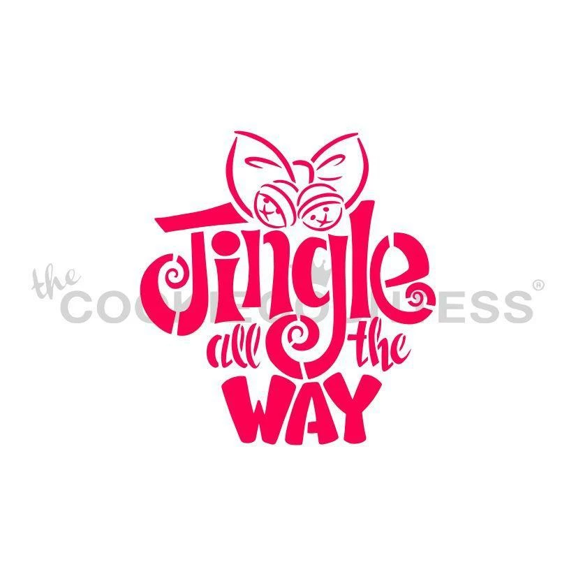 Jingle All The Way stencil. Overall stencil size is approximately 5.5″ x 5.5″. PINK sections in image are the open sections. Stencils are 5mil Food Grade plastic, washable and reusable.Made by the Cookie Countess.