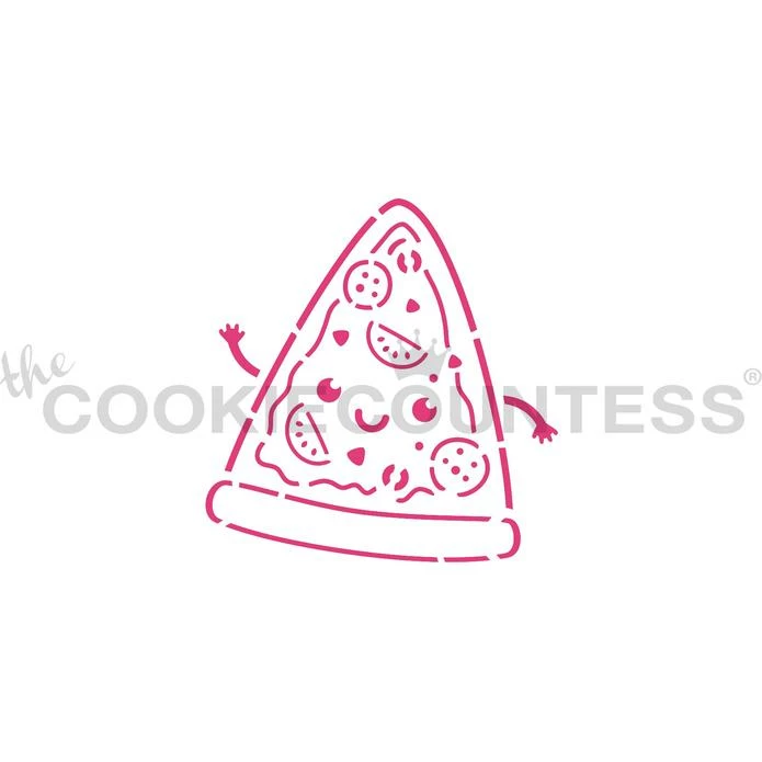 Pizza Paint Your Own stencil. Design size is approximately 2.5 x 2.6″. Overall stencil size is approximately 5.5″ x 5.5″. PINK sections in image are the open sections. Stencils are 5mil Food Grade plastic, washable and reusable. Made by the Cookie Countess.