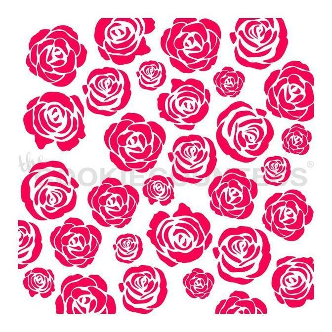 Rose Garden stencil. Overall stencil size is approximately 5.5″ x 5.5″. PINK sections in image are the open sections. Stencils are 5mil Food Grade plastic, washable and reusable.Made by the Cookie Countess.
