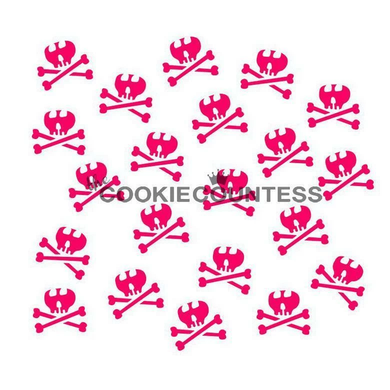 Skulls stencil. Â Each design is about 1.5″ – 2″. Overall size approximately 5.5″ x 5.5″. PINK sections in image are the open sections. Stencils are 5mil Food Grade plastic, washable and reusable. Made by the Cookie Countess.