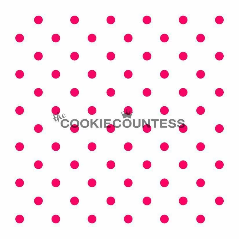 Small Dots stencil. Overall stencil size is approximately 5.5″ x 5.5″. PINK sections in image are the open sections. Stencils are 5mil Food Grade plastic, washable and reusable. Made by the Cookie Countess.