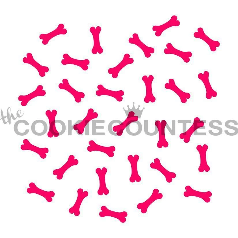 Bones stencil. Overall stencil size is approximately 5.5″ x 5.5″. PINK sections in image are the open sections. Stencils are 5mil Food Grade plastic, washable and reusable. Made by the Cookie Countess.