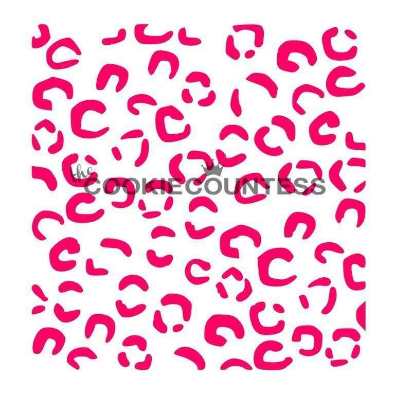 Cheetah stencil. Overall stencil size is approximately 5.5″ x 5.5″. PINK sections in image are the open sections. Stencils are 5mil Food Grade plastic, washable and reusable.Made by the Cookie Countess.