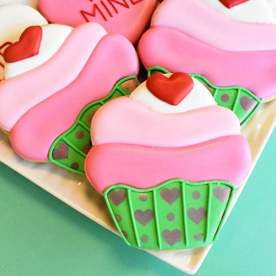 Hearts and Dots stencil. Overall stencil size is approximately 5.5″ x 5.5″. PINK sections in image are the open sections. Stencils are 5mil Food Grade plastic, washable and reusable.Made by the Cookie Countess.