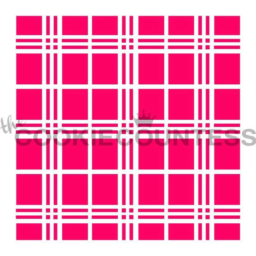 Plaid Mini stencil. Overall stencil size is approximately 5.5″ x 5.5″. PINK sections in image are the open sections. Stencils are 5mil Food Grade plastic, washable and reusable. Made by the Cookie Countess.