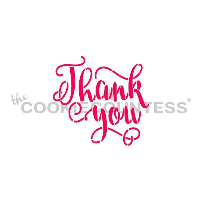Thank You Lettering stencil. Design 2.6″ x 2.41″. Overall stencil size is approximately 5.5″ x 5.5″. PINK sections in image are the open sections. Stencils are 5mil Food Grade plastic, washable and reusable. Made by the Cookie Countess.