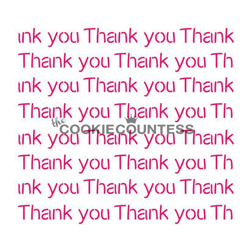 Thank You Repeat stencil. Overall stencil size is approximately 5.5″ x 5.5″. PINK sections in image are the open sections. Stencils are 5mil Food Grade plastic, washable and reusable. Made by the Cookie Countess.