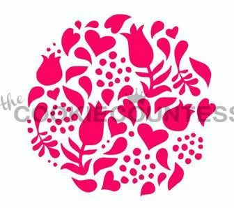 Tulips and Hearts stencil. Overall stencil size is approximately 5.5″ x 5.5″. PINK sections in image are the open sections. Stencils are 5mil Food Grade plastic, washable and reusable. Made by the Cookie Countess.