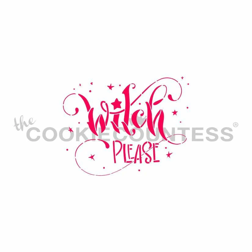 Witch Please stencil. PINK sections in image are the open sections. Stencils are 5mil Food Grade plastic, washable and reusable. Made by the Cookie Countess.