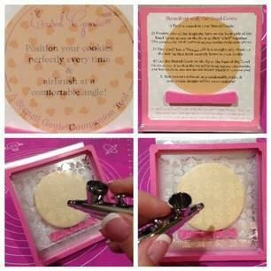 The Easel Genie supports your cookie and Stencil Genie in a handy upright position for airbrushing. The Easel is also great for keeping all your images uniform on the cookie as you are stenciling. Just set it up and your cookies will be in the same spot time after time! The Easel Genie comes with the brushed aluminum easel, two magnetic genie clips (patent pending), and approx 10 disposable liner sheets. (Stencil Genie sold separately)