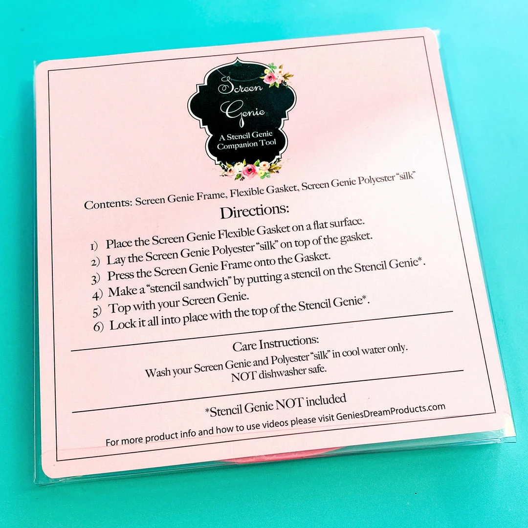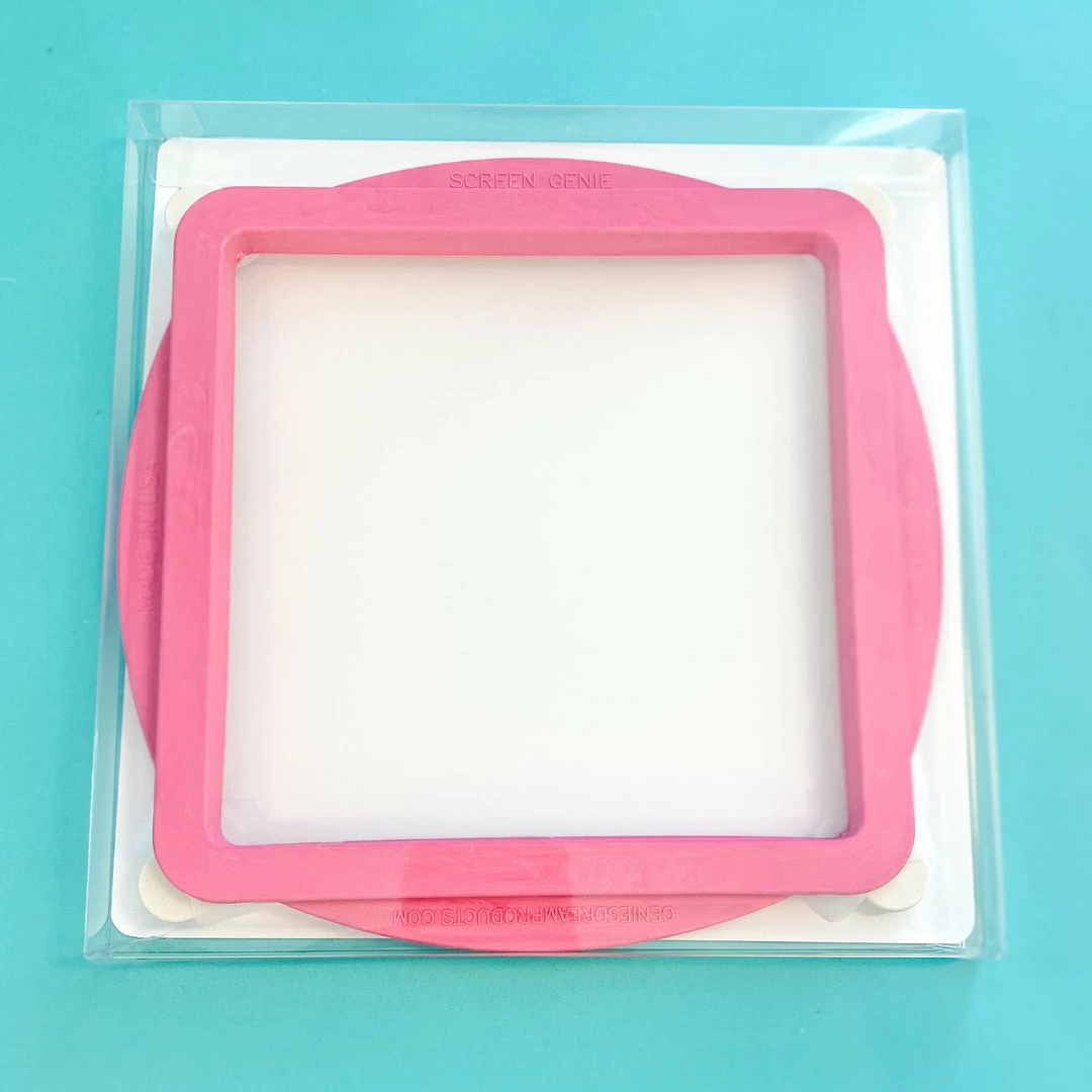 Included: Screen Genie consists of 1 plastic frame sized to your Stencil Genie (sold separately), 1 rubber gasket to hold silkscreen in place, and 1 mesh screen.Â