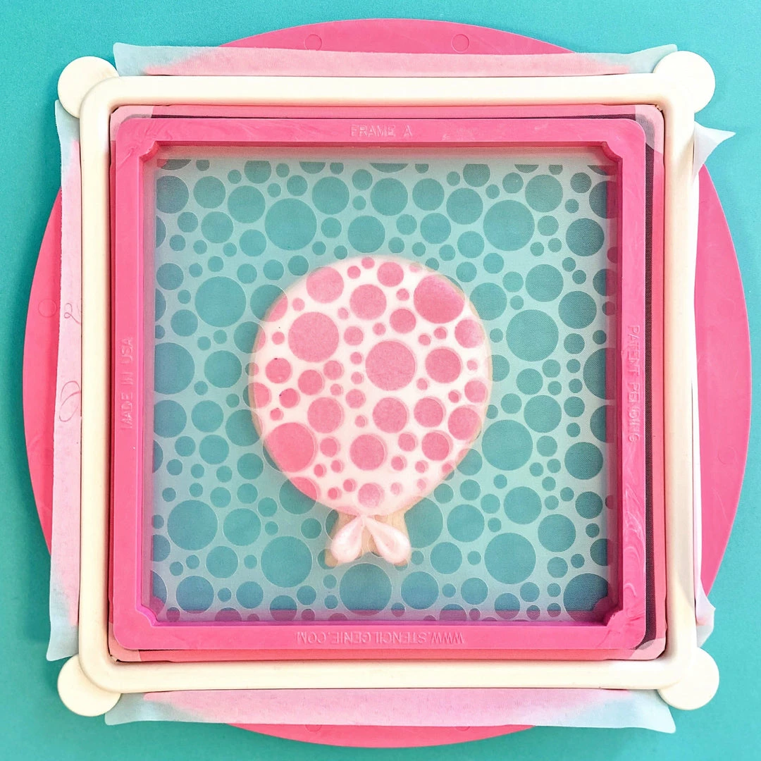 The new SCREEN GENIE will provide crisp, clean stenciling results. Use with both airbrushing and royal icing! Fits perfectly with your Stencil Genie. Add the screen ON TOP of your stencil before clicking in the top of the Stencil Genie frame. The silkscreen mesh holds your stencil against the the cookie so you get perfect results.