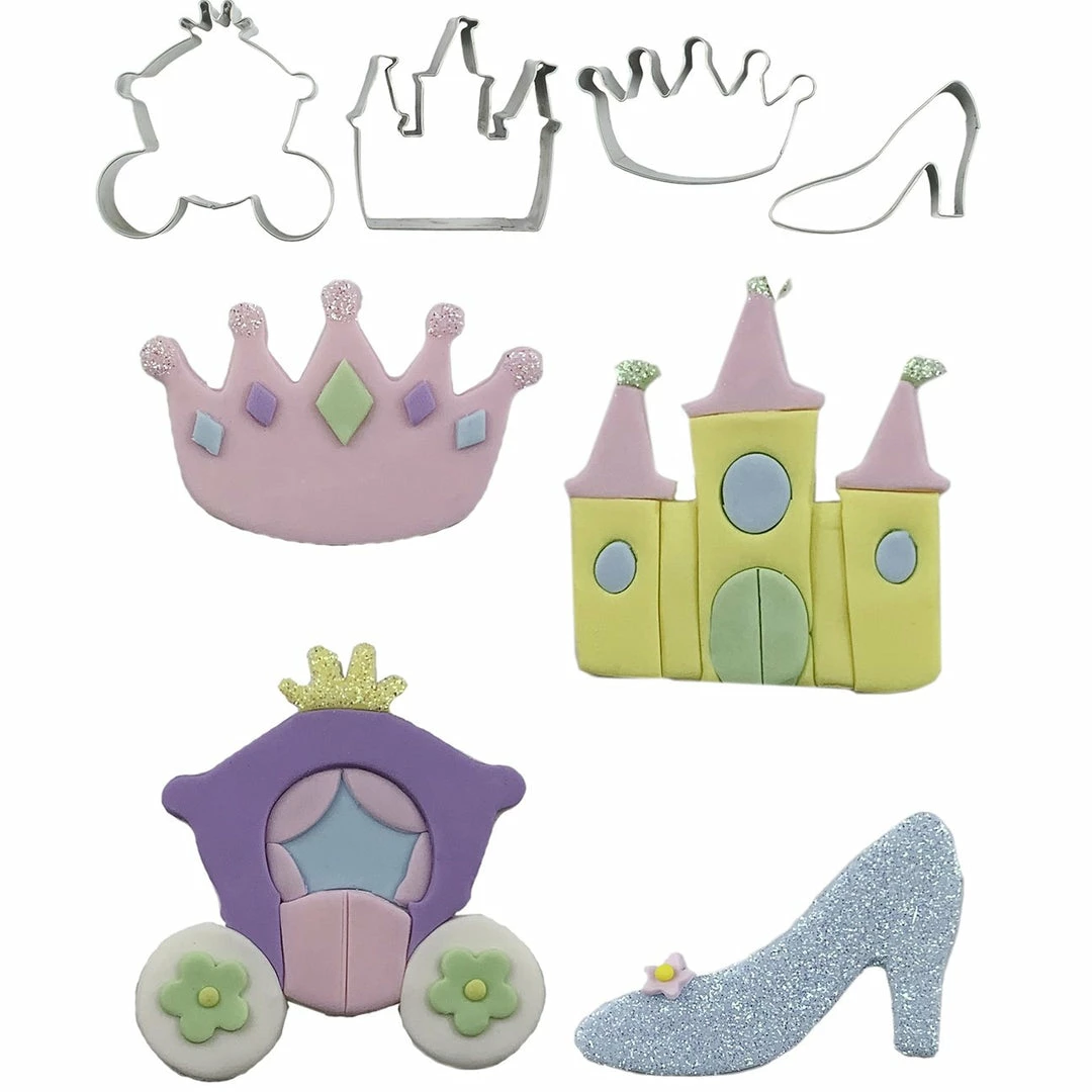 The Sweet Elite Princess Mini Cookie Cutter Set includes 3 cookie cutters. Make quick and adorable accents for cookies. Set contains five stainless steel cutters: crown (2 1/2″ x 1 1/2″ or 64mm x 38mm), castle (2 1/8″ x 2 1/4″ or 54mm x 57mm), carriage (2 1/2″ x 2 1/8″ or 64mm x 54mm) and slipper (2″ x 1 1/2″ or 51mm x 38mm).