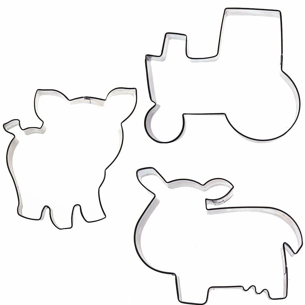 The Sweet Elite Farm Animals Cookie Cutter Set includes 3 cutters.Get ready to decorate some super cute barnyard cookies using the cow, pig, and tractor. Â Hand wash in hot, soapy water. Â Sizes: cow: 3″ x 3 3/4″, pig: 3 1/2″ x 3 1/4″, and tractor: 3″x 3 1/2″.