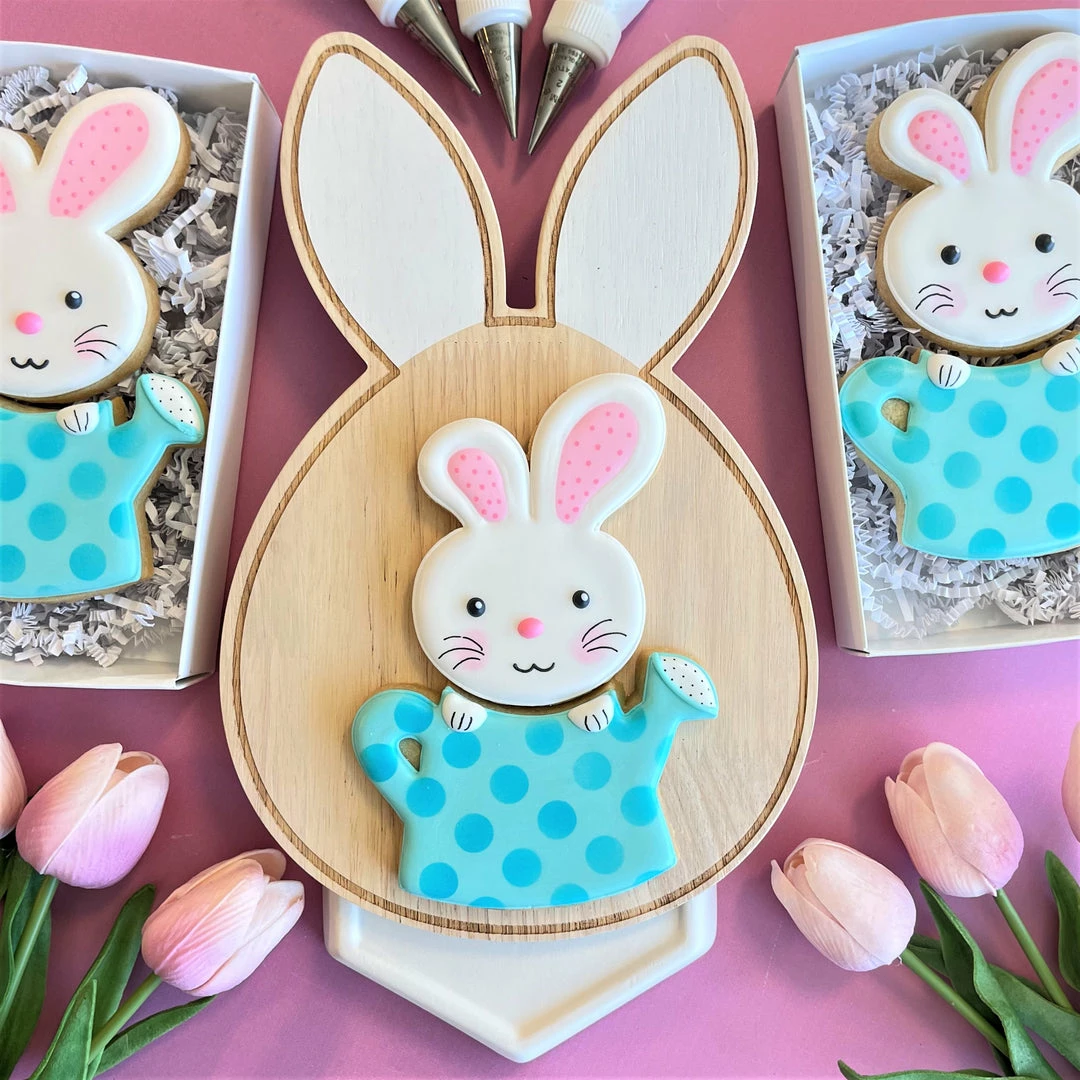 This multi-cutter makes a 2-piece bunny in watering can cookie set. One press for two cuts! And, you don’t have to worry about losing a cutter from the set. The bunny in watering can cookie set is designed to fit in the 7″ window box from BRP Box Shop. This cute bunny in watering can multi-cookie cutter is designed by Anne at The Flour Box!