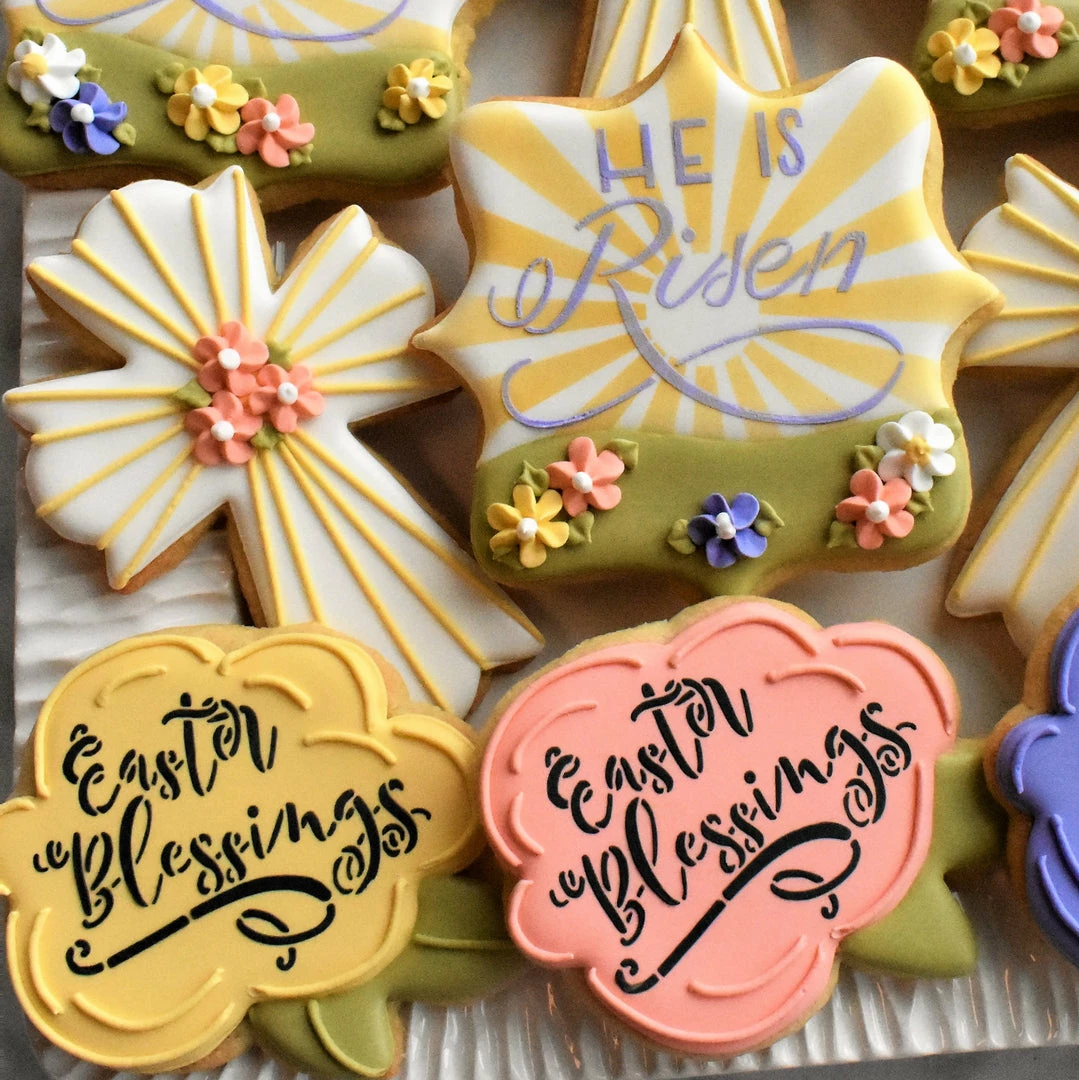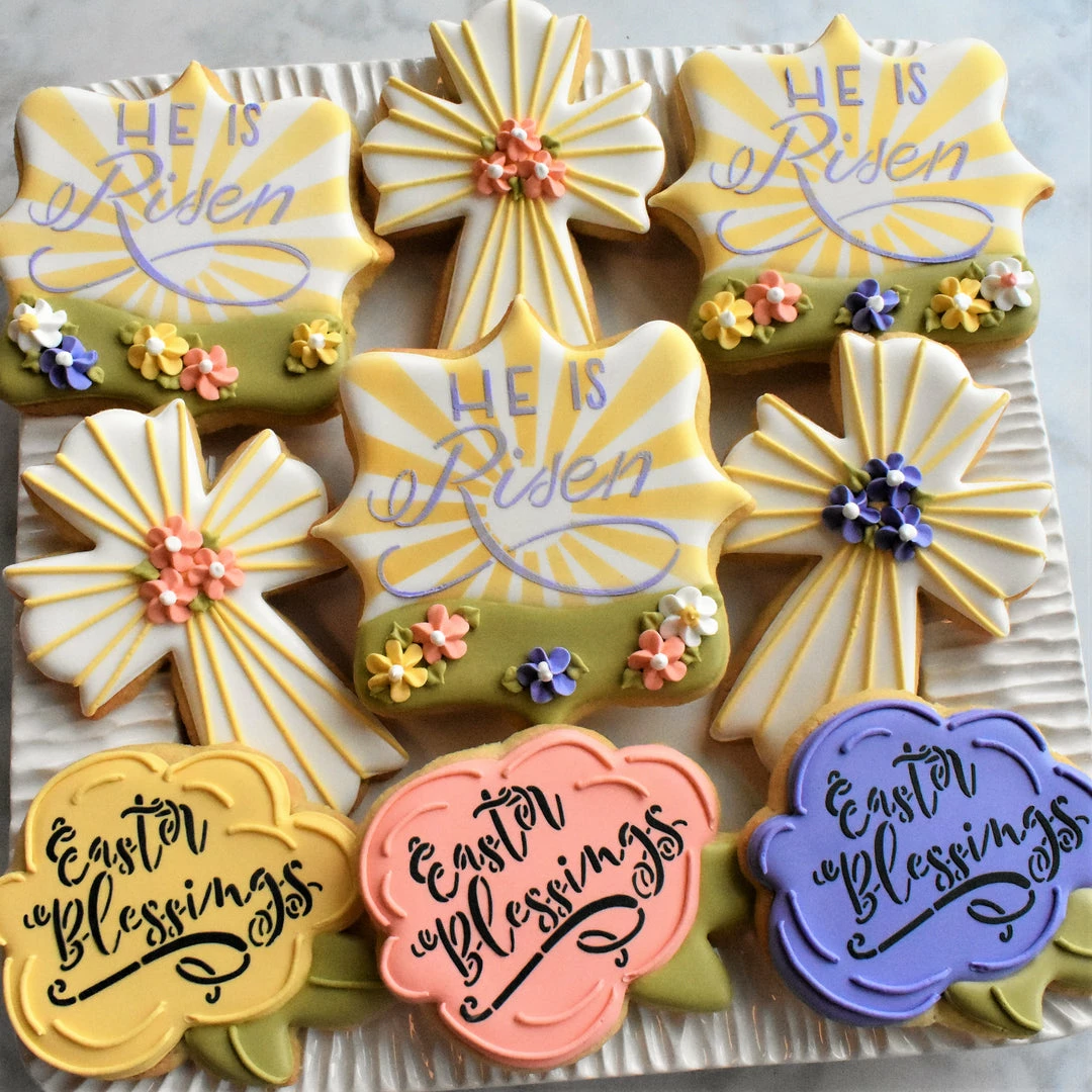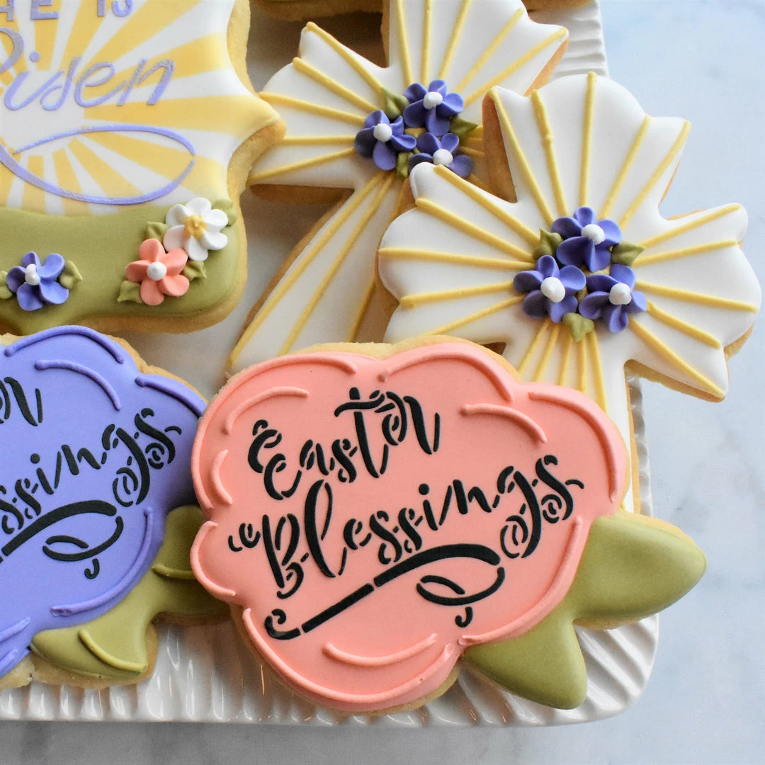 The Easter Blessings Kit includes three exclusive Flour Box Stencils: Easter Blessings, Sunburst, and He is Risen. The cutters featured in the kit are: Fancy Cross, Lilaloa Rose, and Square Plaque. Kit also includes a Wilton tip #129, Wilton tip #349, boo boo stick, and 10 tipless icing bags (5 10″ and 5 13″).