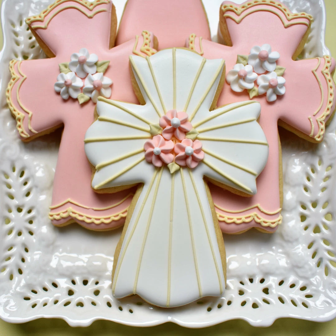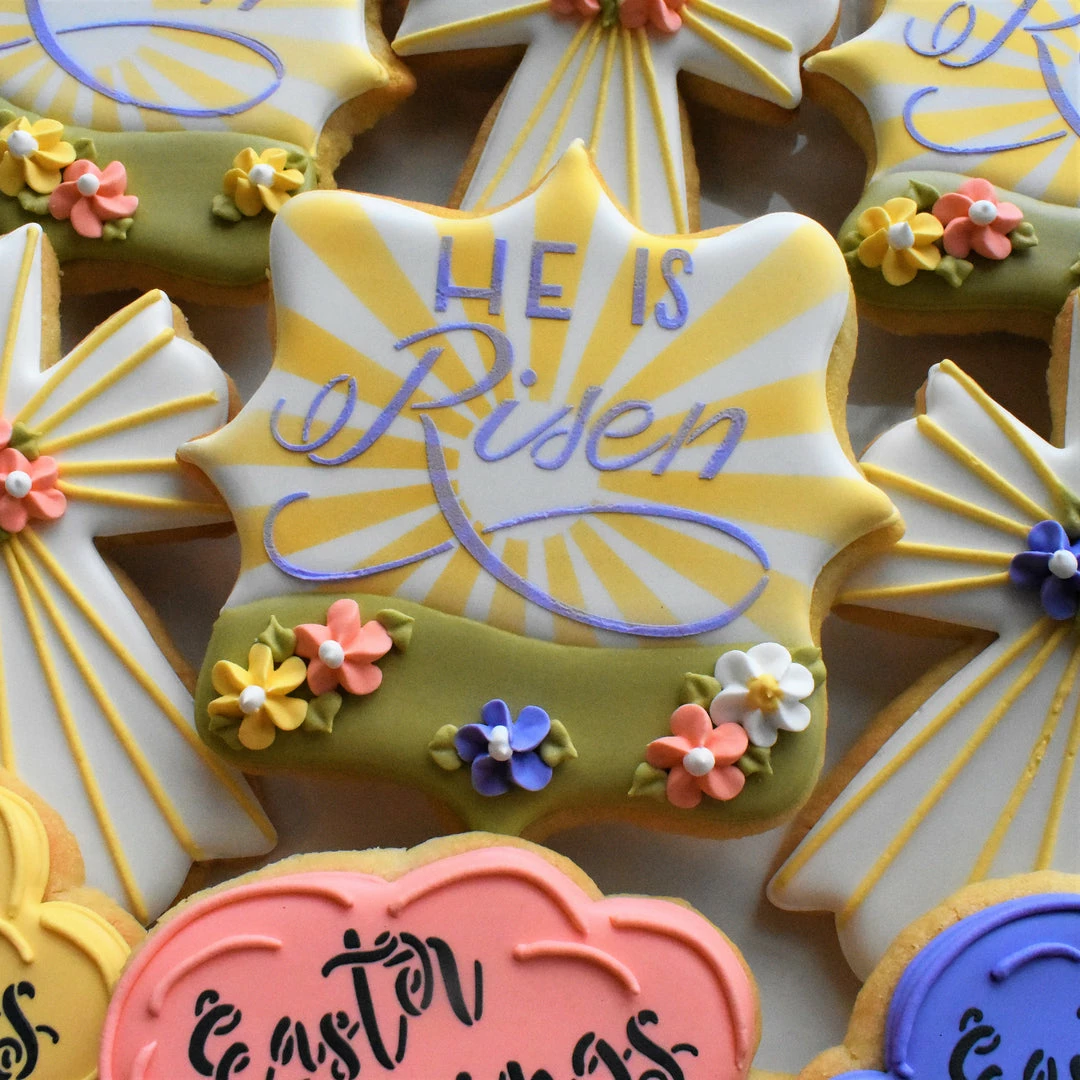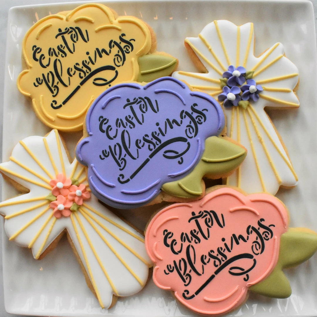 The Easter Blessings Kit includes three exclusive Flour Box Stencils: Easter Blessings, Sunburst, and He is Risen. The cutters featured in the kit are: Fancy Cross, Lilaloa Rose, and Square Plaque. Kit also includes a Wilton tip #129, Wilton tip #349, boo boo stick, and 10 tipless icing bags (5 10″ and 5 13″).