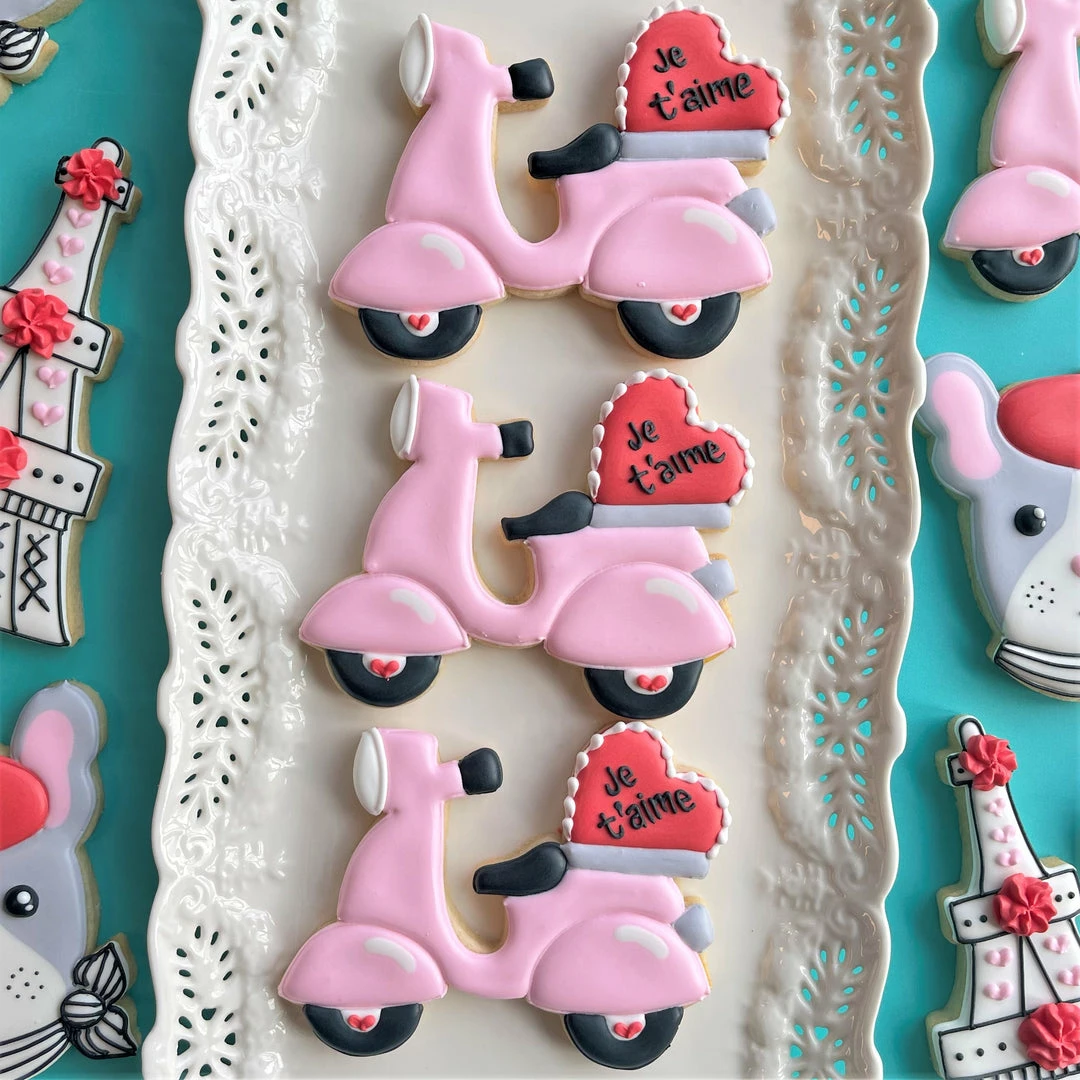 Je T’aime! I love you from here to Paris. Enjoy this Paris Valentine cookie decorating kit! This Paris valentine Cookie Decorating Kit was created for an online class hosted The Flour Box! Purchase the recording of the class. CLICK HERE TO PURCHASE THE CLASS RECORDING. The cost for the class recording is $20. Get ready for the class with this kit! The kit includes four cutters: French Bulldog Face, Eiffel Tower, Scooter, and Macaron, Boo Boo Stick, 10 Icing Bags, PME tip #1, 1 Tip #129, and 4 gel colors: white, coal black, rose pink, super red. (kit does not include the couplers, tips #2 or yellow marker.)
