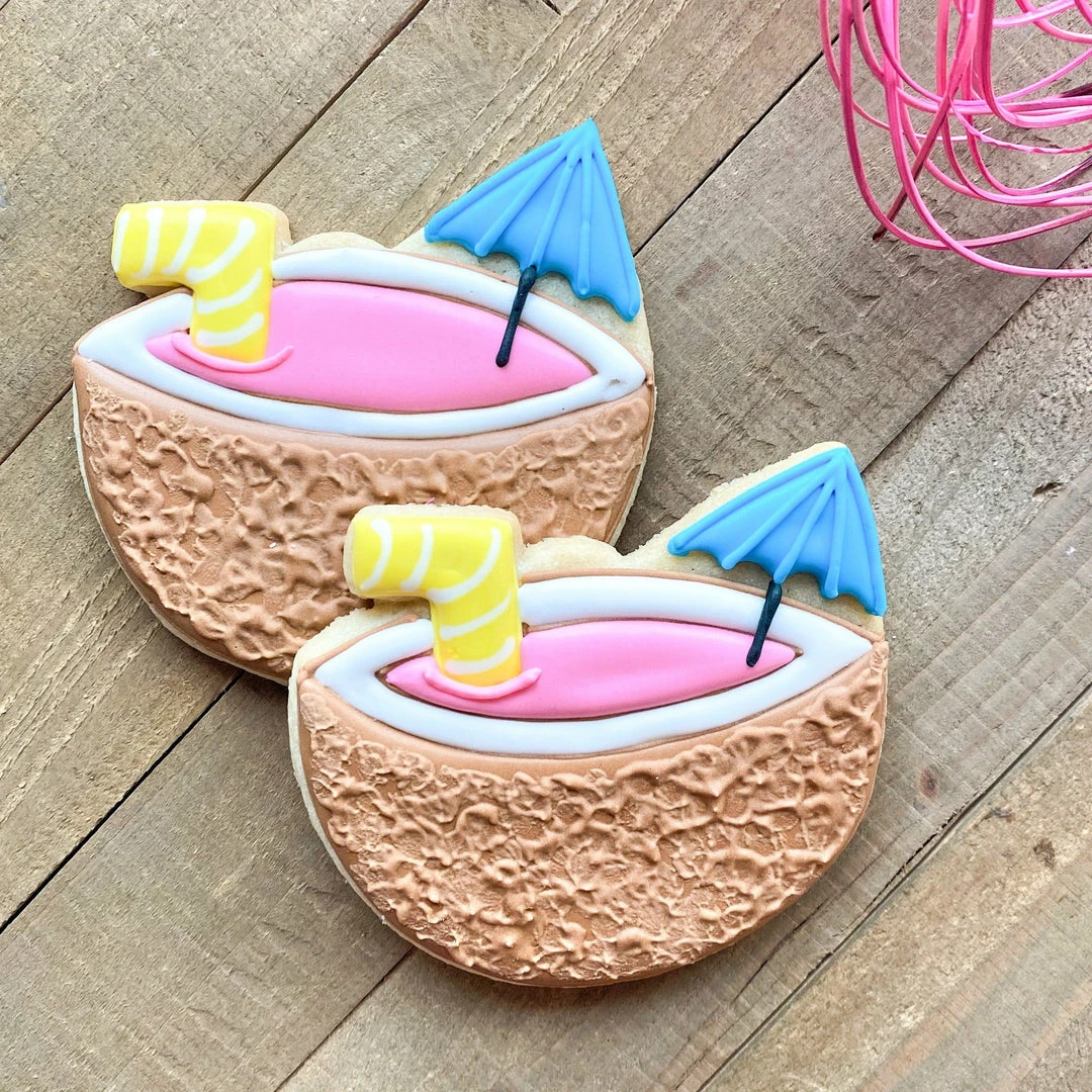 This Pool Party Cookie Decorating Kit was created for an online class hosted The Flour Box! Purchase the recording of the class. CLICK HERE TO PURCHASE THE CLASS RECORDING. The cost for the class recording is $20. Get ready for the class with this kit! The Pool Party Cookie Decorating Kit includes these cutters: Swimsuit with Bow, Coconut Drink, Flamingo Float, and Beach Bag.  Also included is a Wilton 2 pc brush set, 12 tipless bags, 2-1 tool, and 6 Chefmaster Food Gels: Neon Pink, Neon Blue, Neon Yellow, Buckeye Brown, Black Diamond, and Bright White.Â