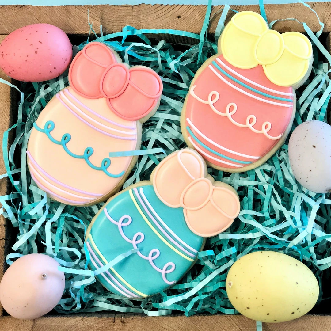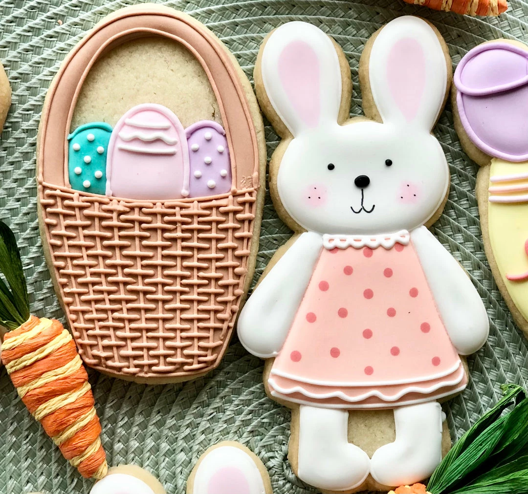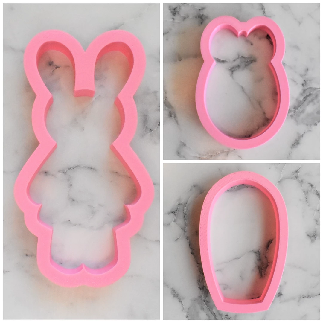 Cutter Size: Standing Bunny measures 5″ tall x 2.5″ wide, Egg with Bow measures 3 1/2″ tall x 2 1/4″ wide, and Easter Basket Tall measures 3 3/4″ tall x 2″ wide.