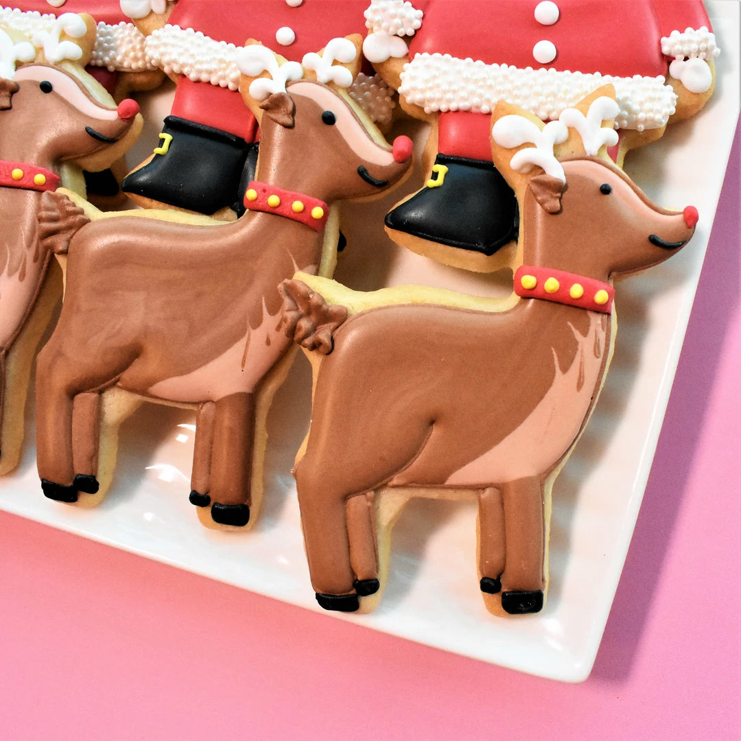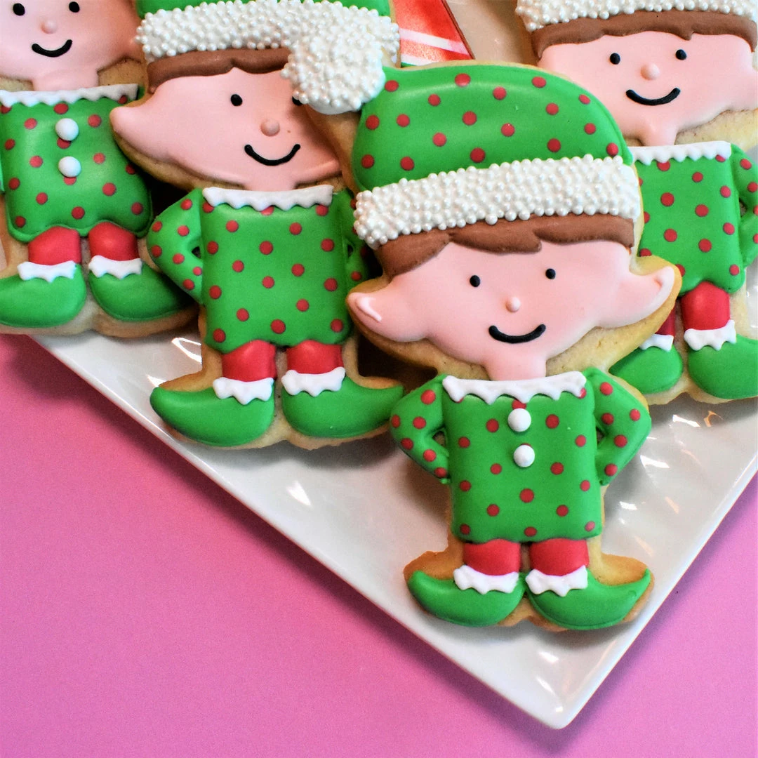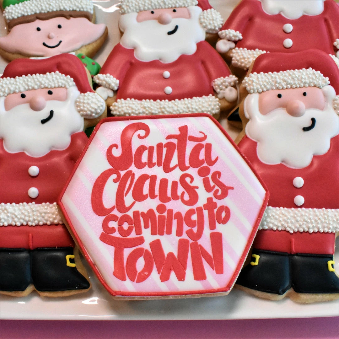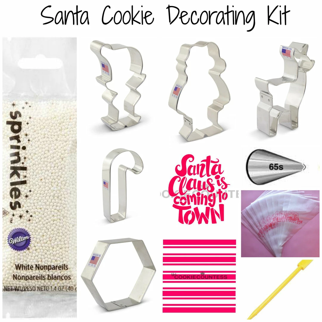 Santa Claus Cookie Decorating Kit. Recreate Santa and his friends with this cookie kitt. There are so many FUN goodies in this box! This kit includes: FIVE cutters (Cute Santa, Elf, Cute Deer, Large Candy Cane, and Hexagon), TWO stencils (Santa Claus is Coming to Town and Preppy Stripes), White Non-Pariel Pouch, Boo Boo Stick, Tip #65s, and 10 Tipless Bags (5 10″ and 5 13″)! **kit does not include standard decorating supplies like ingredients, standard tips like #1 or #2, or food gels. These need to be purchased separately.