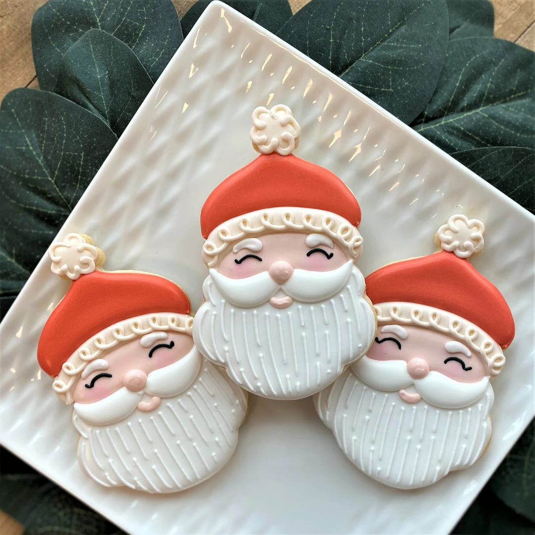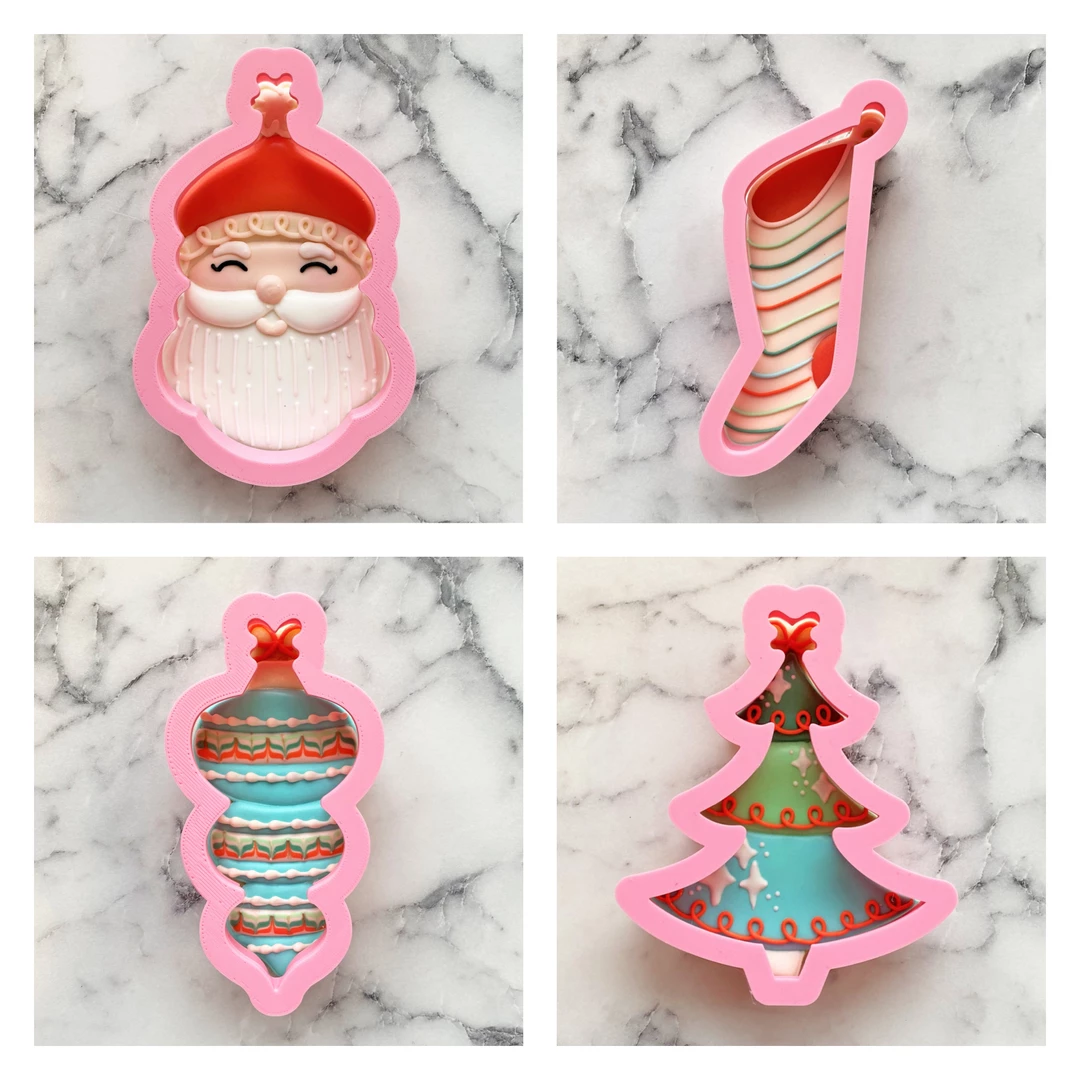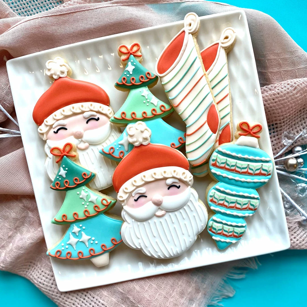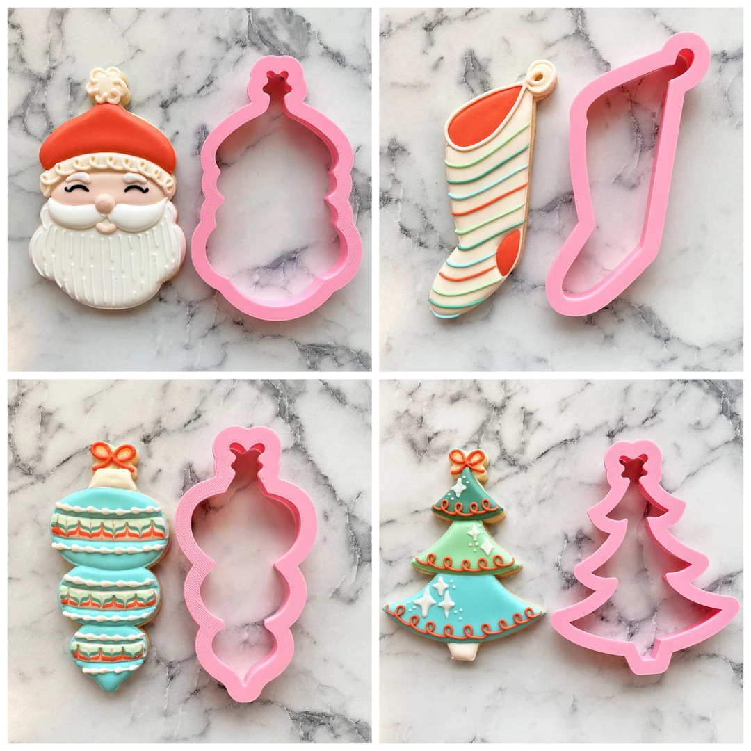The Vintage Christmas cookie cutter set includes the classics, Santa, Tree, Ornament, and Stocking, all cutters designed by Anne at The Flour Box!