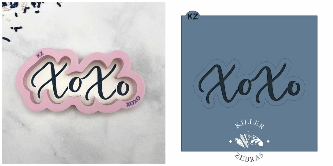 XOXO KZ cookie cutter and stencil set.  Use cookie cutter with matching stencils to make decorating faster and easier!  All stencils are made from reusable food grade plastic that is 7.5 mil thick, and measures 5.5“”w x 5.5″”h. Cutter is made from food safe PLA plastic, and measures approximately 4 1/2″” x 2″”. Hand wash gently with soap and water.  Lay flat to dry. Made by Killer Zebras.Â