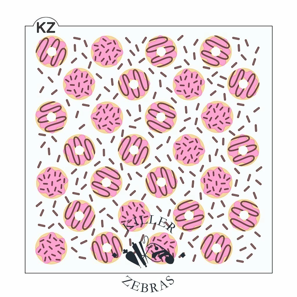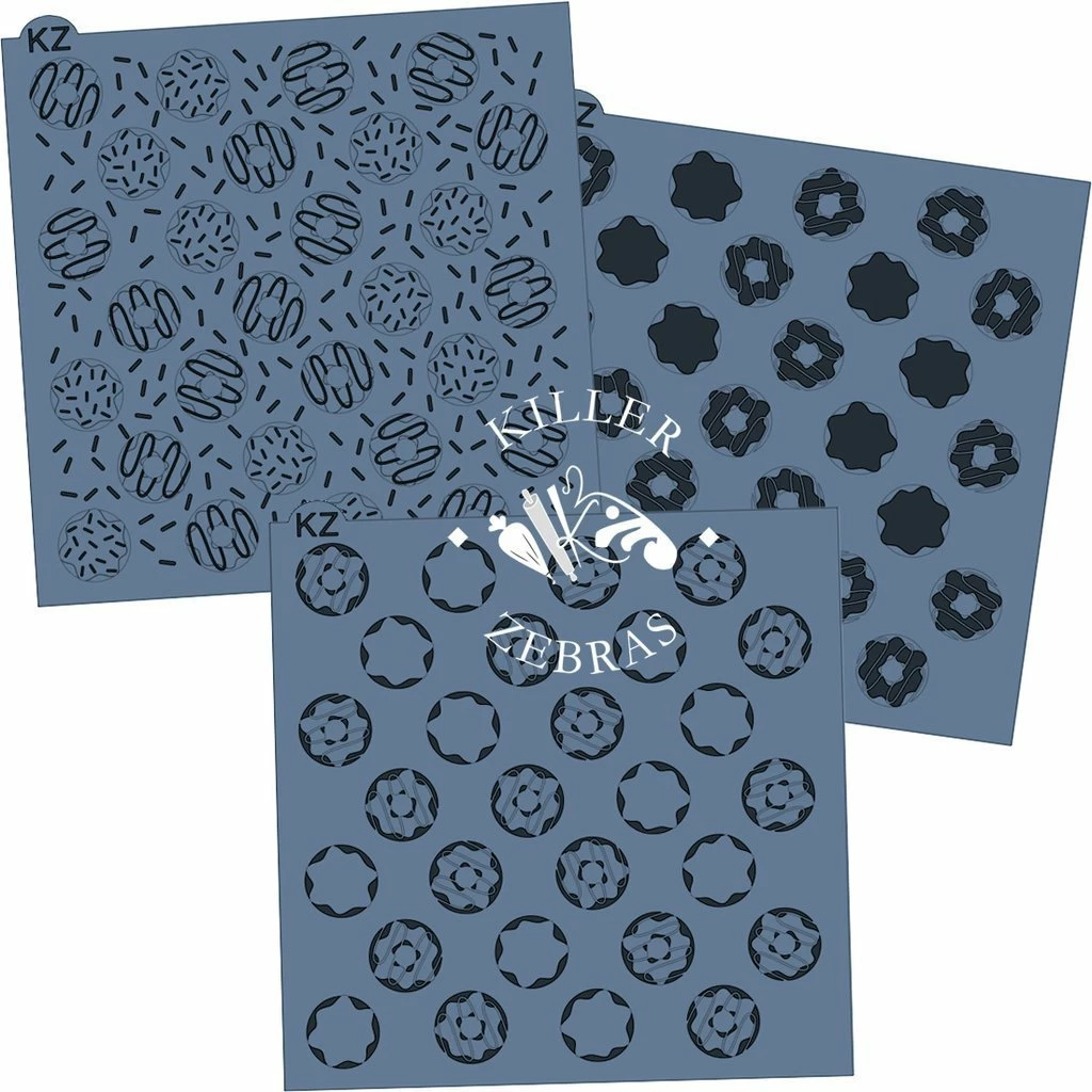 Donuts 3pc KZ stencil. Use stencils to quickly and easily enhance the designs of your cookies! All stencils are made from reusable food grade plastic that is 7.5 mil thick. Stencil measures 5.5″ x 5.5″.  Hand wash gently with soap and water. Lay flat to dry. Made by Killer Zebras.