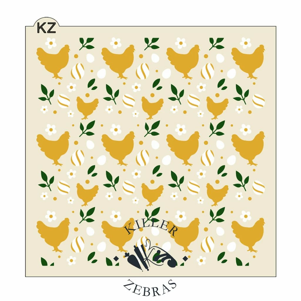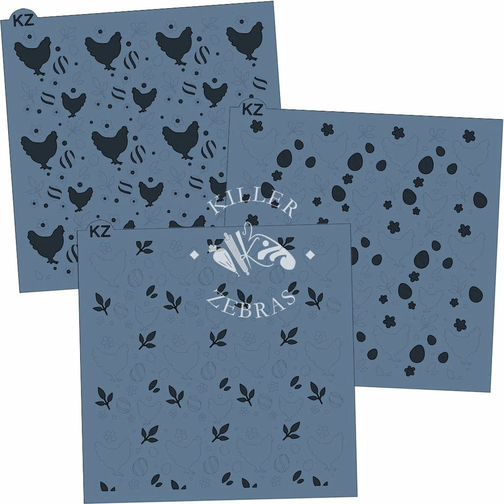 Free Range 3pc KZ stencil.  Use stencils to quickly and easily enhance the designs of your cookies!  All stencils are made from reusable food grade plastic that is 7.5 mil thick. Stencil measures 5.5″ x 5.5″.  Hand wash gently with soap and water. Lay flat to dry. Made by Killer Zebras.