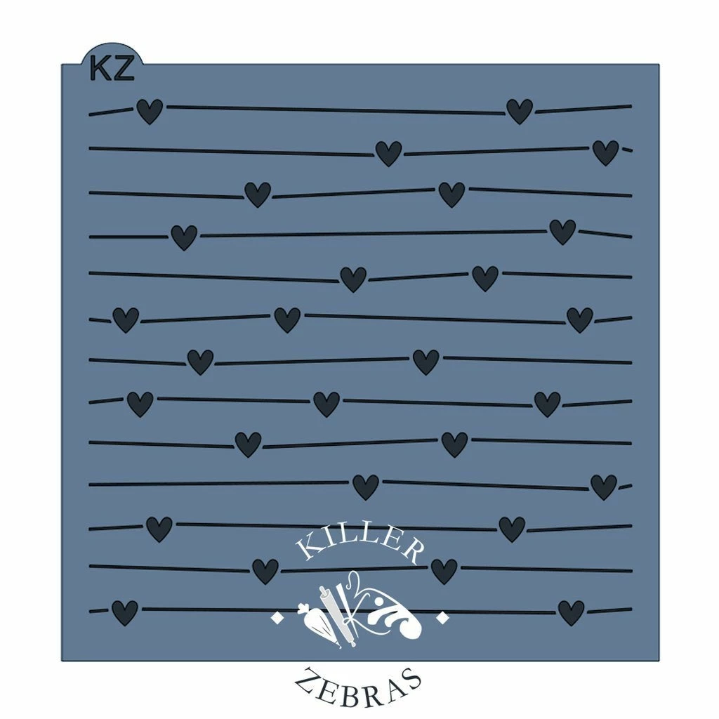 Heart on the Line KZ stencil.  Use stencils to quickly and easily enhance the designs of your cookies!  All stencils are made from reusable food grade plastic that is 7.5 mil thick. Stencil measures 5.5″ x 5.5″.  Hand wash gently with soap and water. Lay flat to dry. Made by Killer Zebras.