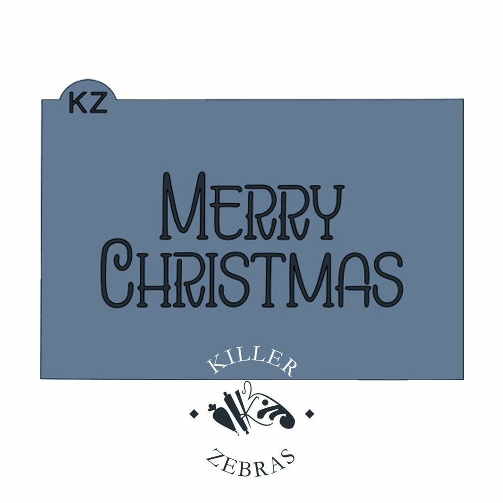 Merry Christmas KZ stencil.  Use stencils to quickly and easily enhance the designs of your cookies!  All stencils are made from reusable food grade plastic that is 7.5 mil thick. Stencil measures 4 1/4″w x 2 3/4″h. Words measure 2.6″ x 1.8″.  Hand wash gently with soap and water. Lay flat to dry. Made by Killer Zebras.