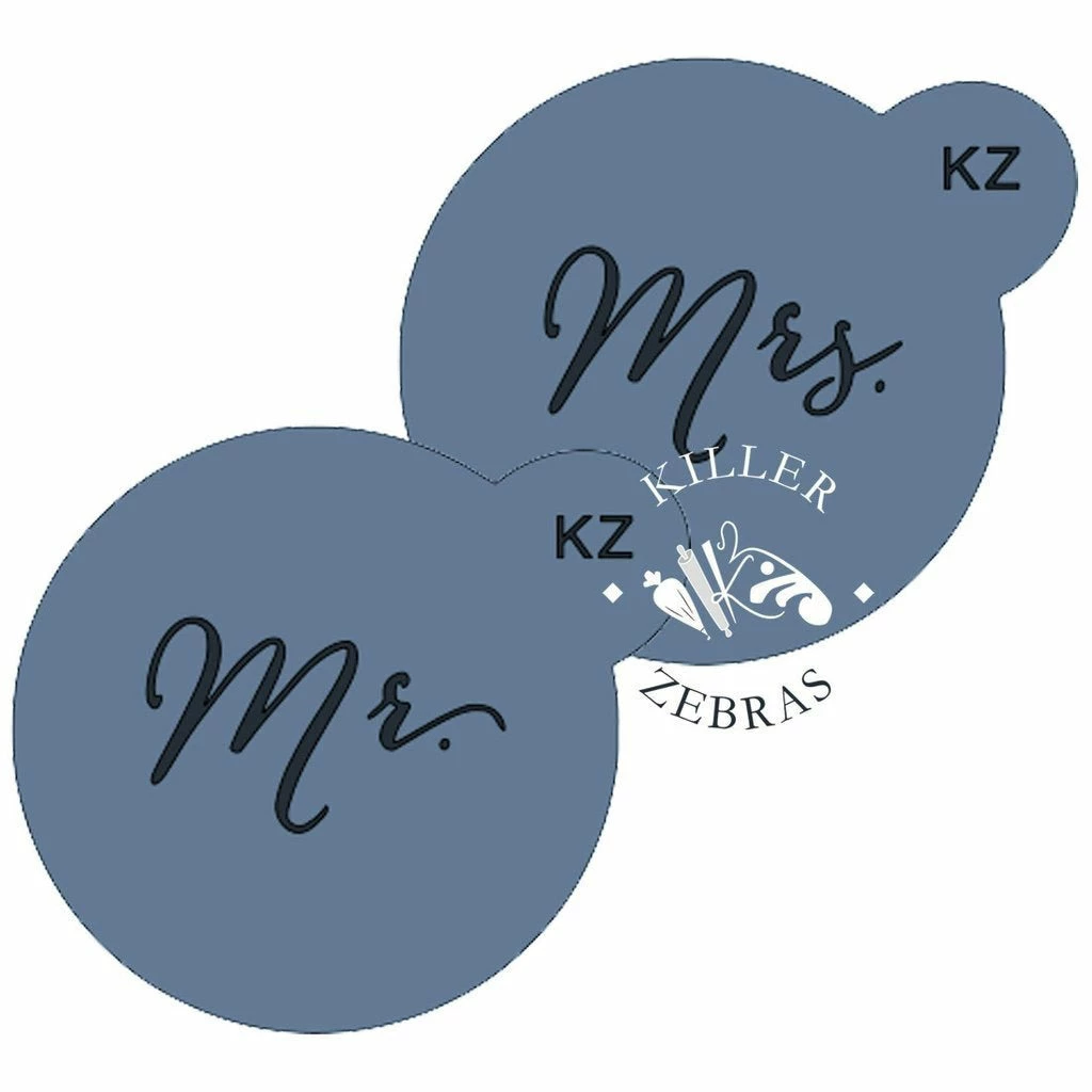 Mr. and Mrs. Minis KZ stencil.  Use stencils to quickly and easily enhance the designs of your cookies!  All stencils are made from reusable food grade plastic that is 7.5 mil thick. Writing measures approximately 1 1/4″ wide.  Hand wash gently with soap and water. Lay flat to dry. Made by Killer Zebras.