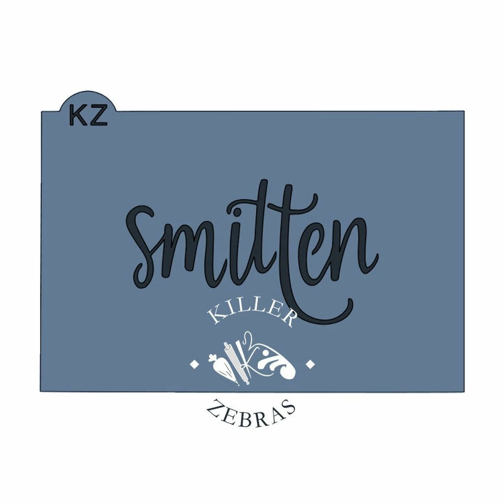 Smitten KZ stencil.  Use stencils to quickly and easily enhance the designs of your cookies!  All stencils are made from reusable food grade plastic that is 7.5 mil thick. Stencil measures 2 3/4″ x 4 1/4″. Writing measures approximately 2 1/2″ wide.  Hand wash gently with soap and water. Lay flat to dry. Made by Killer Zebras.
