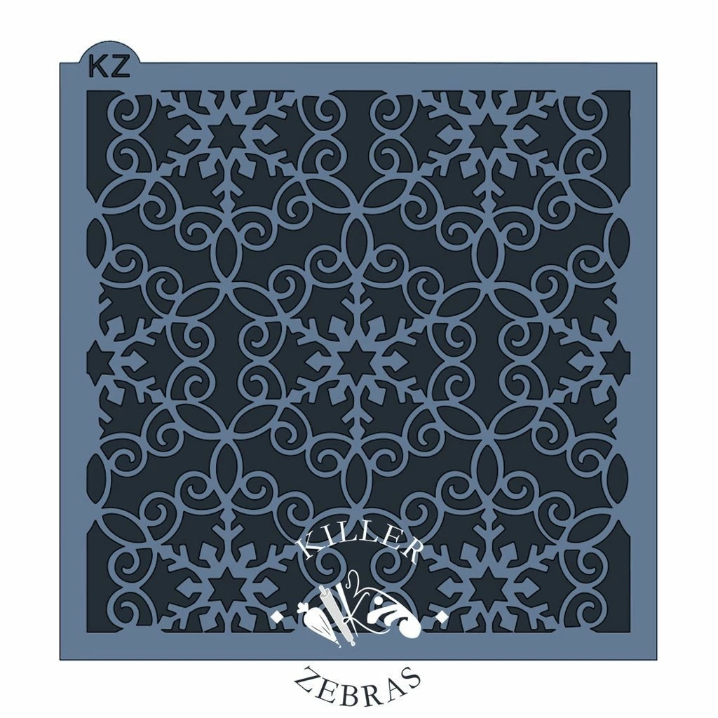 Snowflake Lace KZ stencil.  Use stencils to quickly and easily enhance the designs of your cookies!  All stencils are made from reusable food grade plastic that is 7.5 mil thick. Stencil measures 5.5″ x 5.5″.  Hand wash gently with soap and water. Lay flat to dry. Made by Killer Zebras.