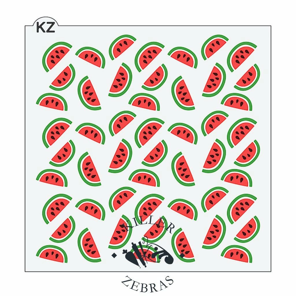 Watermelon 3pc KZ stencil.  Use stencils to quickly and easily enhance the designs of your cookies!  All stencils are made from reusable food grade plastic that is 7.5 mil thick. Stencil measures 5.5″ x 5.5″.  Hand wash gently with soap and water. Lay flat to dry. Made by Killer Zebras.