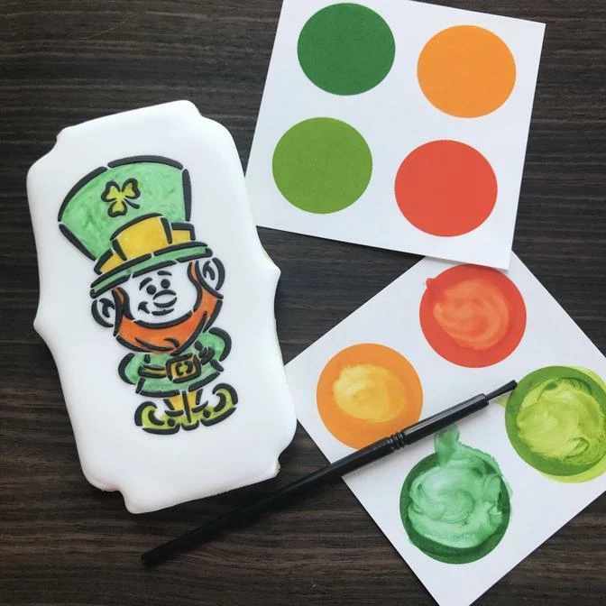 Have fun making a edible art! Edible paint in 4 colors (colors appear darker then final result) -lime green, green, yellow and orange. Palettes come 12 to a pouch. Leave in pouch until time to use. 2 year shelf life. Avoid moisture until it’s time to use. Each palette is 3.25” x 3.25”, color circles are 1.5”. Ingredients: Sugar, tapioca starch, water, microcrystalline cellulose, glycerine, corn syrup solids, modified corn starch, sodium alginate, titanium dioxide, polyglycerol esters, citric acid, potassium sorbate (preservative), FD&C blue #1, red #3, red #40, yellow #5, yellow #6